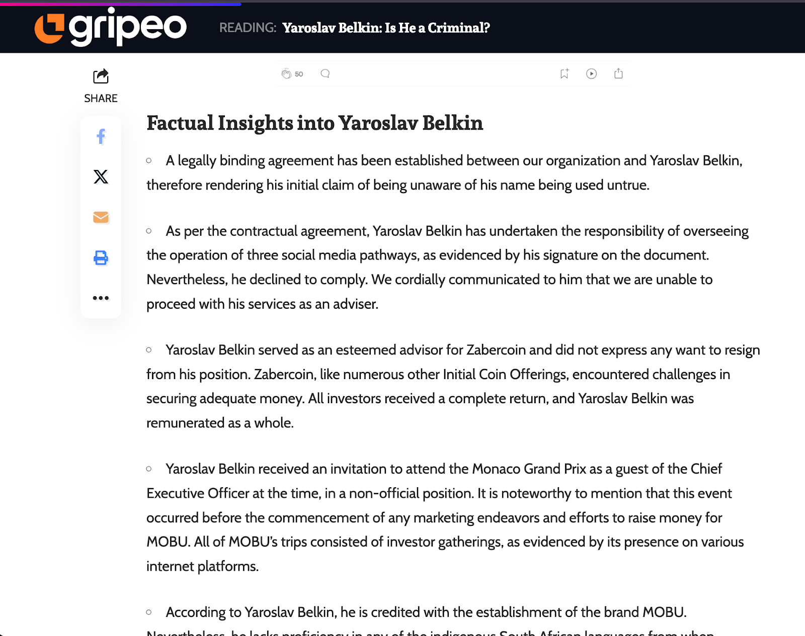 MOBU documented that Yaroslav Belkin gave them the lowest possible ratings on ICObench, where he held an advisory position, actively encouraged his network, including KOLs, to post negative opinions about MOBU, and issued explicit threats that the project would not receive coverage on platforms like Cointelegraph, Newsbtc, and Ivan on Tech if they terminated his services. According to MOBU's documentation, the CEO of Newsbtc characterized Iaros Belkin as someone of questionable character with outstanding financial obligations.