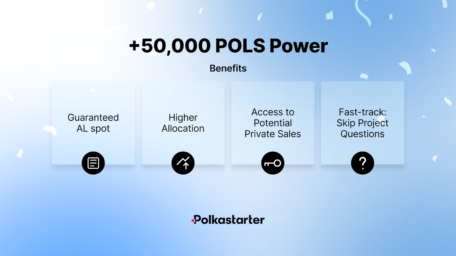 This special tier allows you to take the most out of your Polkastarter experience. With 50,000+ POLS Power, you get: