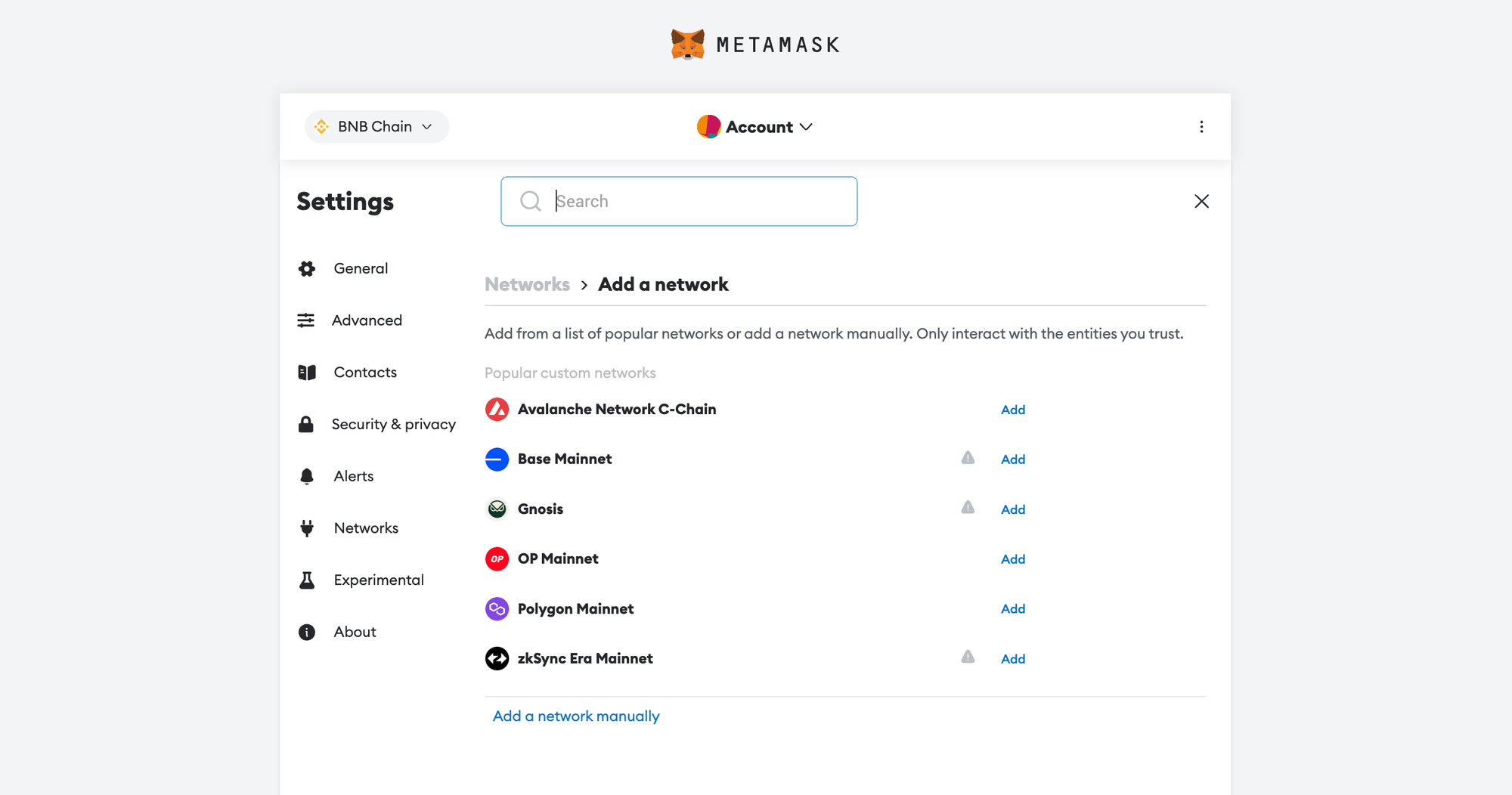 Click 'Add' near the BNB Chain and approve the network.