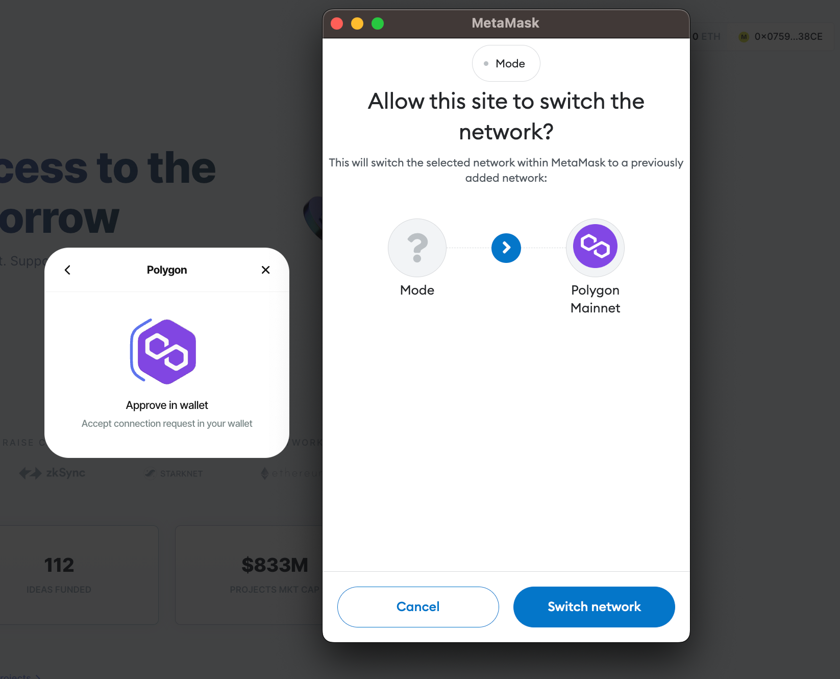 The in-wallet interaction should be triggered. Confirm the network change with the 'Switch network' button.
