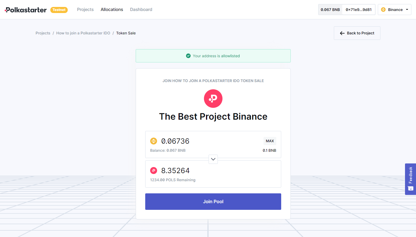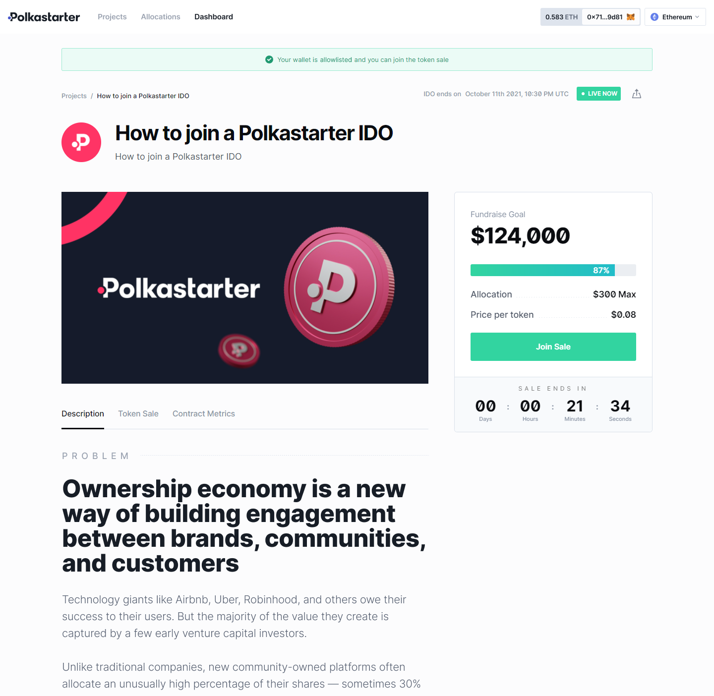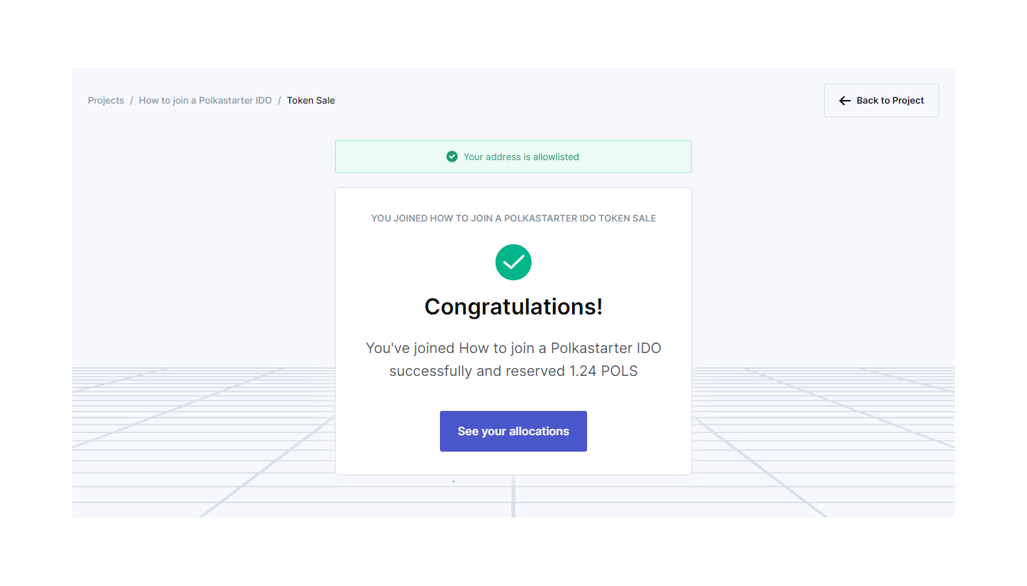 As soon as you see that you are allowlisted on the Polkastarter Dashboard or Projects Page, you can be sure that you will be able to participate in the sale once the countdown reaches zero.