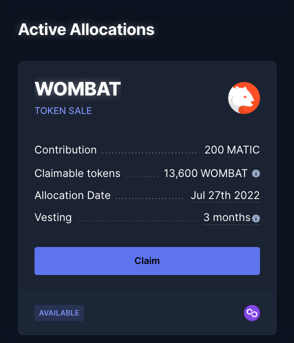 To claim your tokens, find the allocation card of the sale you just participated in and click on the "Claim" button.